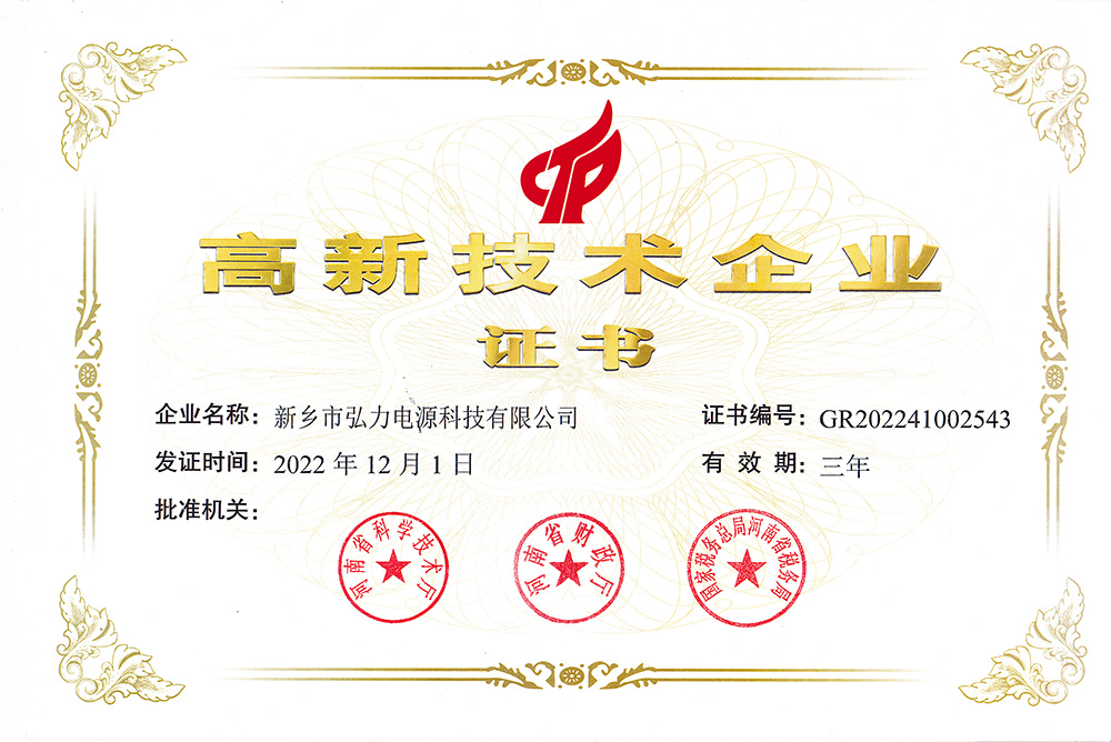 泓力傾力打造新鄉(xiāng)、焦作、成都三大生產(chǎn)基地,努力構(gòu)建“優(yōu) 質(zhì)原料供應(yīng)、先進(jìn)生產(chǎn)制造、高 效物流配送、貼心售后服務(wù)”的完備運(yùn)營體系,持續(xù)推進(jìn)“材料創(chuàng)新+產(chǎn)品創(chuàng)新+技術(shù)創(chuàng)新”的深度融合。奮斗鑄就實(shí)力,泓力新能源共獲得各項(xiàng)專 利50余項(xiàng),并榮獲“河南省制造業(yè)頭雁企業(yè)”、“河南省瞪羚企業(yè)”、“河南省質(zhì)量標(biāo)桿”、“河南省錳系鋰離子電池工程技術(shù)研究中心”等多項(xiàng)榮譽(yù)。